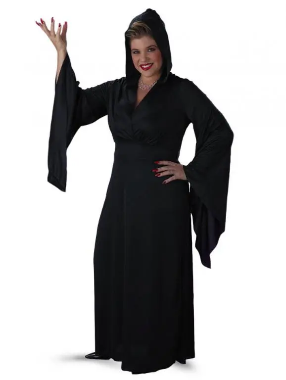 Perfect for a vampire, witch or sorceress!Costume Includes: Black hooded dress/robe with low cut front and extra flared sleeves. Snake Armband. Available size: