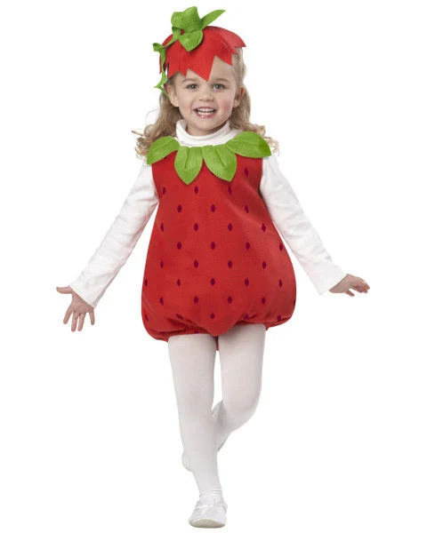 The Infant Toddler Strawberry Girl Costume is reserved only for the very sweetest little girls. This adorable little romper is shaped like a ripe strawberry and has a green leaf collar. It also comes with a really cute strawberry stem hat. This costume will be as cute as can be for a girl who wants to dress up like her favorite fruit. She will be your little strawberry shortcake in this fun costume. The romper is printed with strawberry seeds for design and realism. With three size from which to choose, little girls from 1 to 4 years old can enjoy wearing this costume for Halloween or even a dance recital. We have many other fruit costumes for girls too so check them out here.