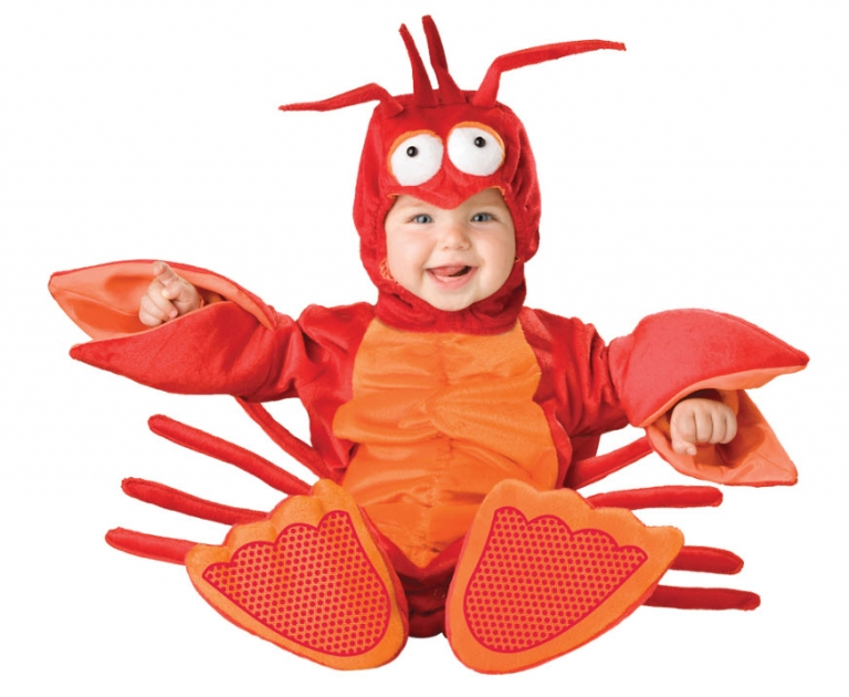Costume includes: Red lined zippered jumpsuit with lobster claw arms and attached lobster legs with snaps for easy diaper change, hood with antennae, plus slip-on booties with skid resistant bottoms. (Booties are for indoor use only).