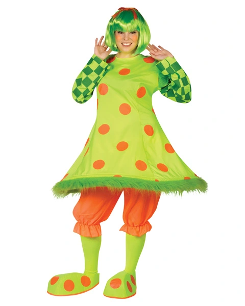 Hoop dress, bloomers, wig, green tights and clown shoe covers.