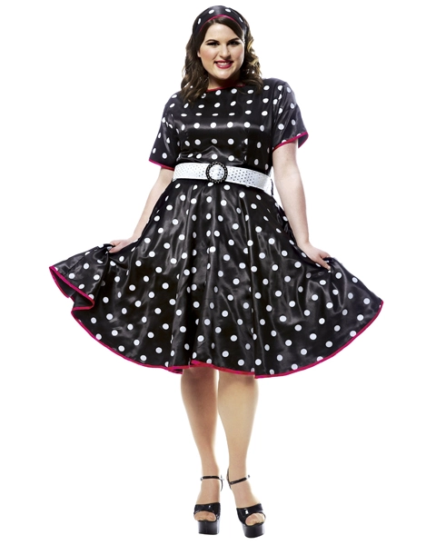 You won’t need a plutonium-powered Delorean or 1.21 gig watts to transport yourself back in time with this Plus Size Hot 50’s Black Costume for adults this Halloween. The costume consists of a shimmery, flirty black fabric with bright white polka dots. Magenta trim runs along the hemline and neckline, as well as the sleeves. A white belt is included with the Hot 50’s costume that features a reversal of the dress’s pattern (black polka dots on white) to break up the flow of the costume into halves, thereby giving a slimming look to the overall costume. The included headdress comes in the same pattern as the dress and features the same magenta trim. So whether you’re going to the sock hop or just your neighbor’s Halloween party, this Hot 50’s costume is sure to be a hit. Try out a pair of our Black 50’s sunglasses below to really complete this already nifty costume.