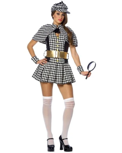 On the trail of a flirty costume idea? Look no further than our Plus Size Sexy Detective Costume for adults! There won’t be any mystery about what makes this costume such a hit at Halloween parties. The short sexy dress of this Detective costume comes in a black and white checkered pattern just like those worn by so many famous sleuths. Also included with this costume is a matching cape and newsboy hat in the same checkered pattern. The gold buttons that run down the front of the dress do a great job of accenting when combined with the included gold belt. The cape has a black bow to tie around the neck that matches the black patches on the sides of the dress, giving this detective costume a level of detail even the most hardened of snoops would appreciate. So don’t wait any longer, because the trail could grow cold, but this costume never will.