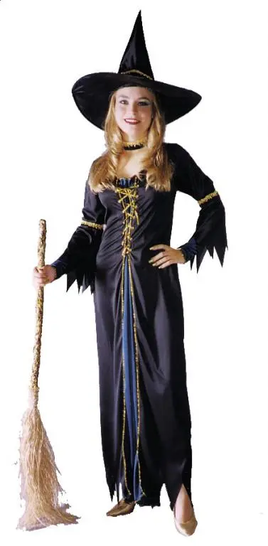 A Wonderful WitchCostume includes: Long black bewitching gown with lace-up bodice, flowing inset and zig-zag drape sleeves, gold trim sleevelets, gold armbands, gold choker and witch hatAvailable size: