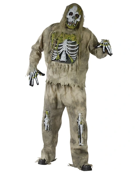 If you’re the type that believes Halloween should be a time to celebrate ghoulishness and not a time for fairy tale costume ideas, then our Skeleton Zombie adult plus size costume is probably your costume of choice. You’ll love everything about this zombie themed ghoulishness which includes four pieces for a complete look including a tattered shirt with skeleton graphics and green moss; pants that have the same effect with tattered effects on the legs which help expose some yummy and ghoulishly delightful bones; a detailed skeleton face that looks as though it has just arose from the ashes, and skeleton hands that look as though you’ve risen straight from the filthy grave! This deluxe costume is complete for any effect you’re after, but if you want even more ghoulish detail check out our accessories department for some add-ons like makeup or blood to add to your face and hands! * Includes shirt and pants with bones, mask and gloves * Shoes not included