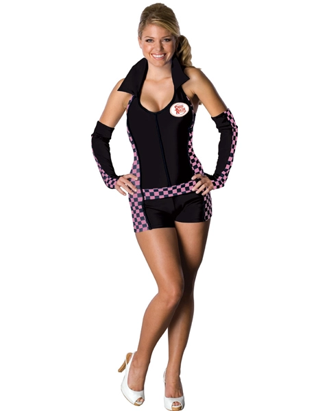 You can be the main squeeze of cartoon hero and movie star Speed Racer when you wear this officially licensed Speed Racer Trixie Costume for Adult ladies. This tantalizing costume features a form-fitting black romper trimmed with racing flag checkered flags. Matching fingerless long gloves complete a sexy outfit that is perfect for theme parties, or a rollicking Halloween night dance. The Trixie costume for ladies is one size fits most and is suitable for ladies in sizes 6 to 12. You can add to the style of this unique costume with a Super Model Wig for Adults and Black Back Seam Fishnet Pantyhose. Adult White Patent Mary Jane Shoes are a fantastic looking addition to the ensemble, or you can choose Patent Lace-Up Boots in White to round out a costume that is sure to get the attention of the guys at your next party.