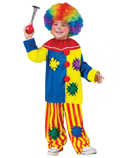 Some children are a little bit scared when they see a clown and yet clowns should be fun and are there to be enjoyed so why not make sure your child doesn’t develop a fear of clowns by introducing them very early on in the form of their Halloween costume because with our Toddler Big Top Clown Costume you have the chance to show your child just how fun and loveable clowns really can be. The Clown Costume has a top which is yellow and blue and has green, yellow and purple patches printed on to it, there are puffy red pom-pom buttons and a lovely collar in red, this costume also includes pants that are red and yellow striped with green and purple printed patches. You can also add to this costume by purchasing some clown make-up, a rainbow clown wig and even a horn, all available to purchase from our huge accessory range. * Includes a colorful pullover top with pom-poms, baggy striped pants and collar. * Clown wig, horn and makeup sold separately.